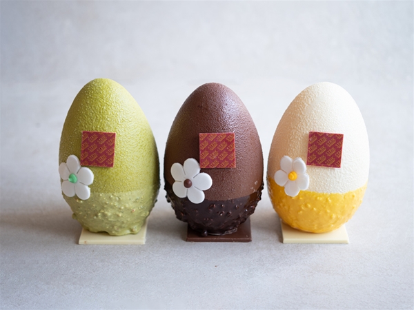 Prachtige paasei met de onderkant in crunchy chocolade gedipt (±20cm). In de kleuren groen, melkchocolade en witte chocolade.