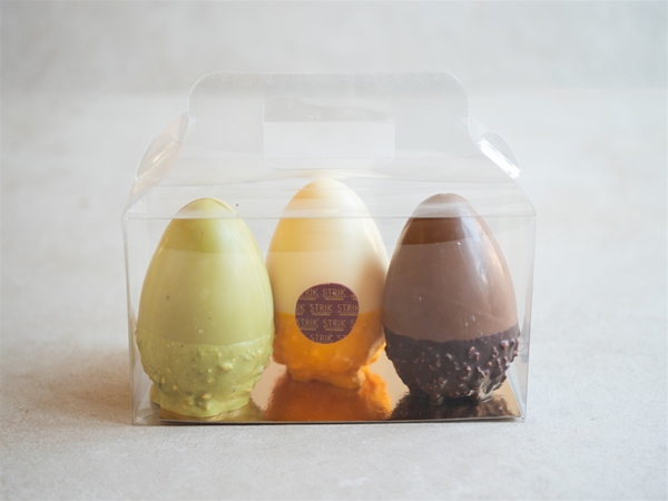 Prachtige paaseitjes met de onderkant in crunchy chocolade gedipt (±13cm). In de kleuren groen, melkchocolade en witte chocolade. In luxe blister. Let op: eieren zijn hol (geen vulling).